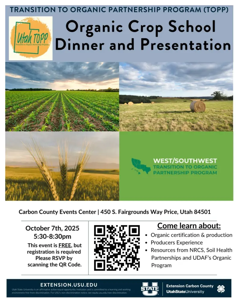 The USU Extension Organic Crop School will be held at the Carbon County Events Center on Tuesday, Oct. 7, beginning at 5:30 p.m. To keep up with what’s happening at Extension, visit the group’s Facebook page.