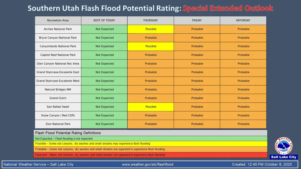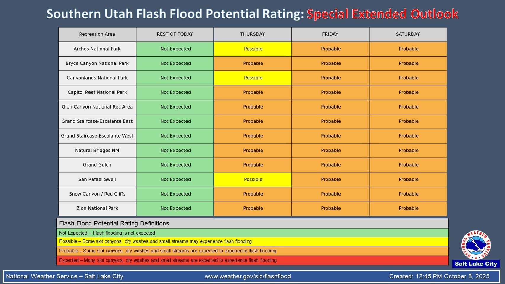 “A special extended outlook was issued for the Southern Utah Flash Flood Potential Rating due to the long duration of this event. Most parks & rec areas are expected to experience flash flooding Thursday into Saturday,” states a social media bulletin from the NWS.