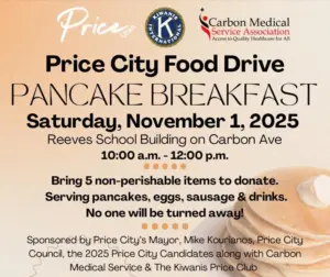On Saturday, Nov. 1, Price City, in conjunction with the Kiwanis Club of Price, Carbon Medical Service, and the 2025 Price City Council candidates, will host a food drive/pancake breakfast to help feed the community.