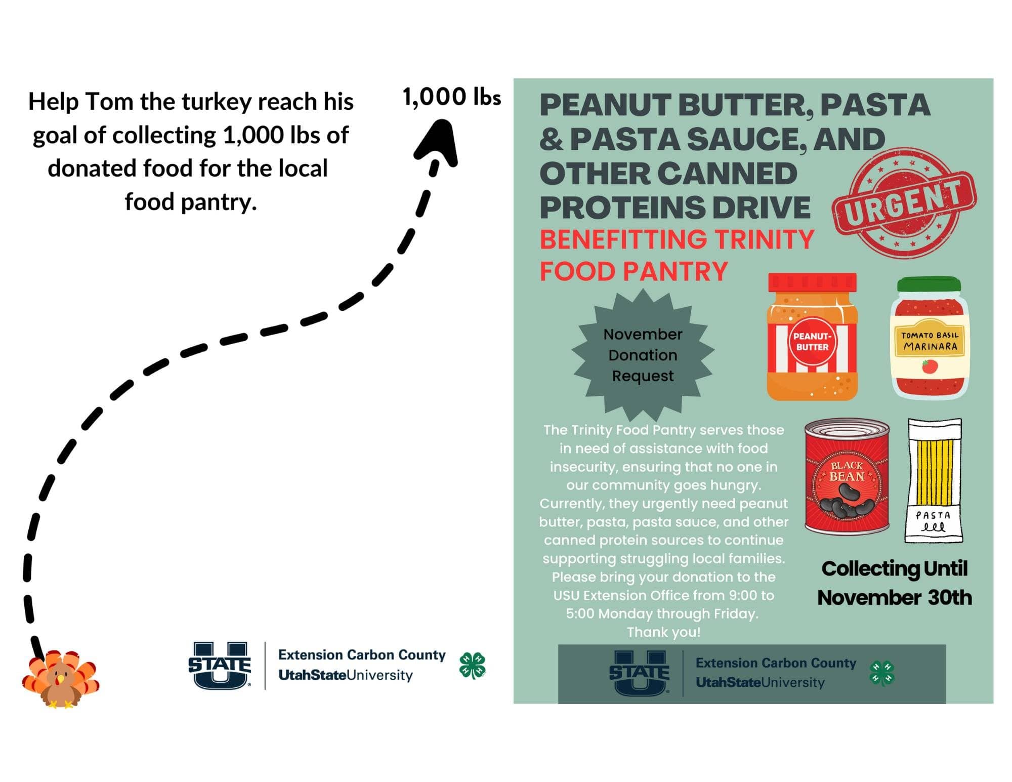 USU-Extension Carbon County is also playing a role in combating potential food crises by hosting a November food drive to donate 1,000 pounds to the Trinity Food Pantry. The organization is seeking canned proteins, pasta, pasta sauce and peanut butter. Donations can be dropped off at the USU Extension Office in the Carbon County Administration Building, 751 East 100 North, Suite #1700.