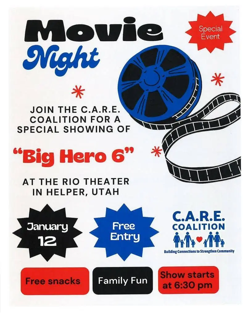 The C.A.R.E Coalition’s family movie night takes place on Monday, Jan. 12, beginning at 6:30 p.m. at Helper’s Rio Theatre. The event is free and open to the public, with snacks provided for those in attendance.
