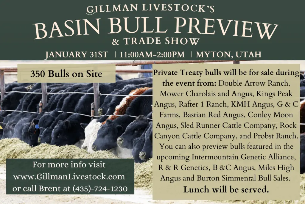 Gillman Livestock’s Basin Bull Preview and Trade Show takes place on Saturday, Jan. 31, from 11 a.m. to 2 p.m. in Myton, Utah. For more information on the event, visit www.gilmanlivestock.com or contact Gillman at 435-724-1230.