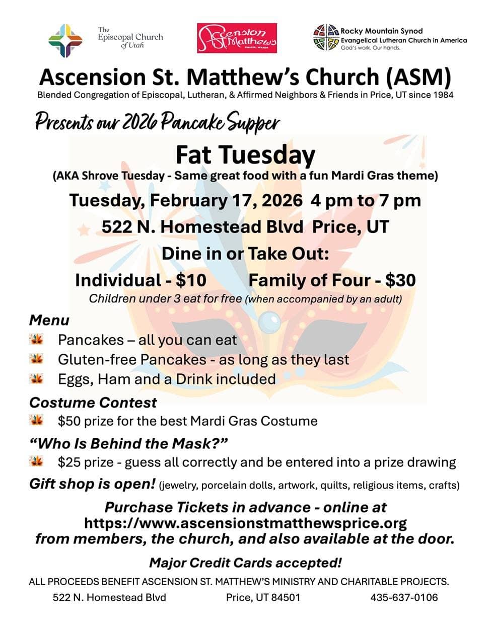 Ascension St. Matthew’s Fat Tuesday Pancake Supper takes place on Tuesday, Feb. 17, from 4 p.m. to 7 p.m. at the church located at 522 North Homestead Boulevard. To purchase tickets or for more information, visit www.ascensionstmatthewsprice.org.