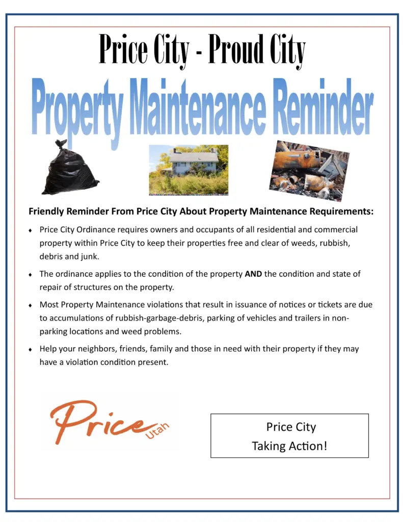 “As we get closer to spring and summer again, Price City would like to remind all owners and occupants of residential and commercial property within the city that the Price City property maintenance code requires that properties be kept free of weeds, rubbish, debris, junk and no parking of vehicles or trailers in non-parking areas is allowed – such as on the front yard,” reads a release from the city.