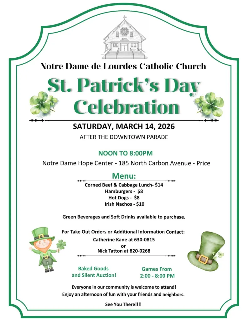 One of the Castle Country’s favorite yearly traditions returns to Price on Saturday, March 14, as Notre Dame de Lourdes Catholic Church hosts its St. Patrick’s Day celebration, featuring the ever-popular corned beef and cabbage meal.