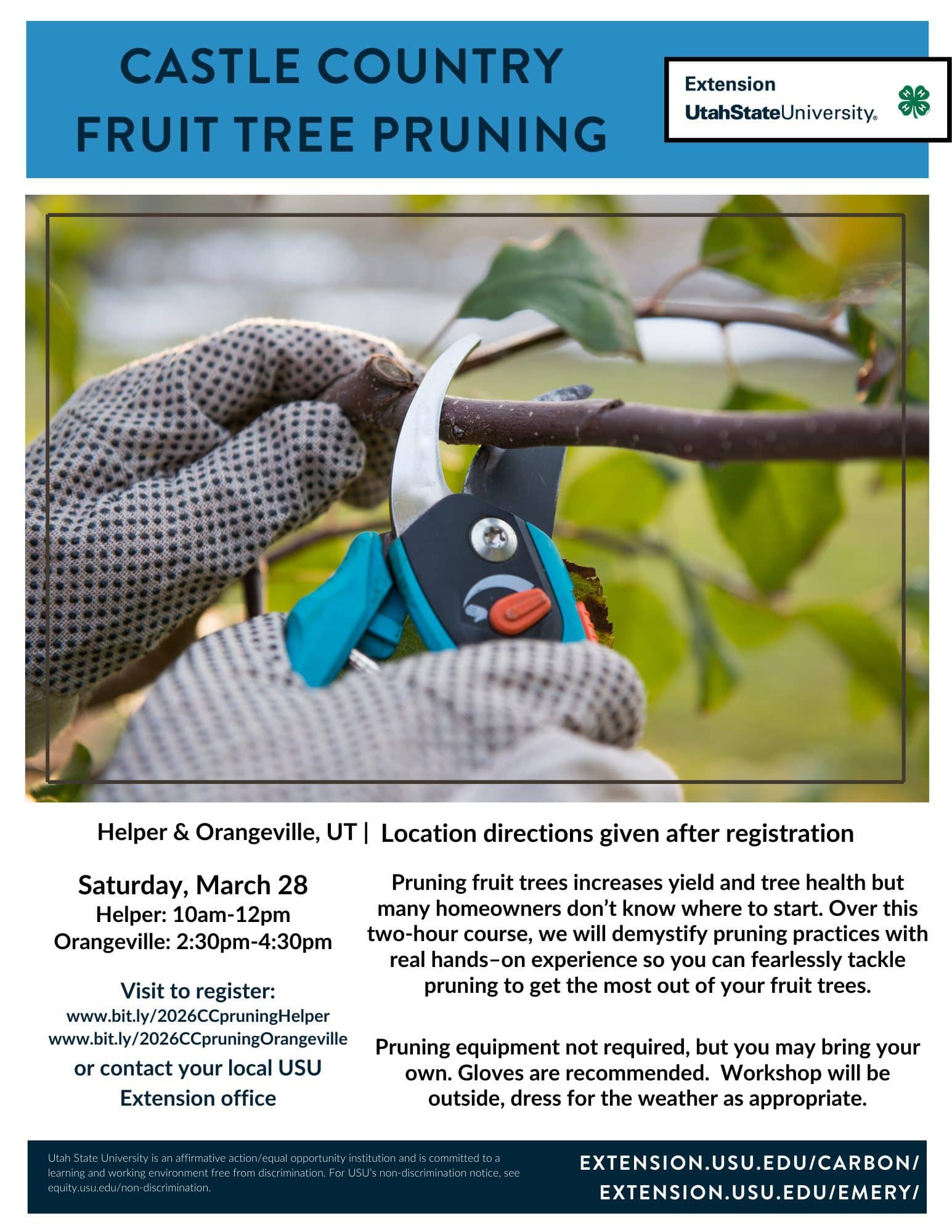 As residents across the Castle Country prepare for the growing season, Utah State University Extension is preparing agriculture enthusiasts through an Apple Grafting Workshop on March 19 and a Fruit Tree Pruning Workshop on March 28.