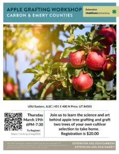 Registration for USU Extension’s Apple Grafting Workshop costs $20 and is open on Eventbrite. The workshop will take place on Thursday, March 19, and run from 6 p.m. to 7:30 p.m.
