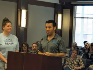 Cody Bunderson speaks to the Carbon County Commission after receiving the Carbon County Heart and Character Award.