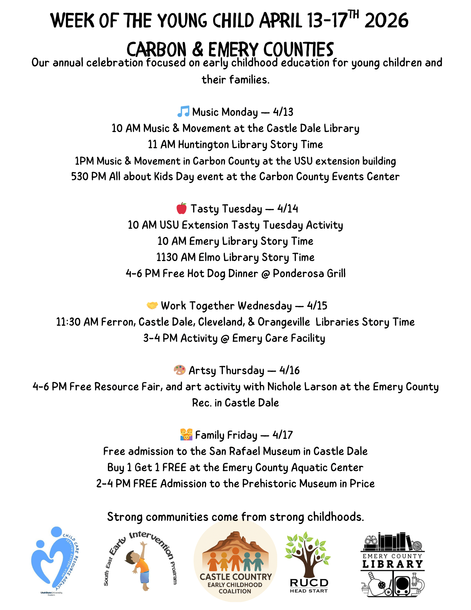 Supporting parents and building community, the Week of the Young Child is returning to Carbon and Emery counties, Monday, April 13, to Friday, April 17. The Week of the Young Child is an event hosted by a variety of community organizations, created to get families out of the house and to educate them about community resources.