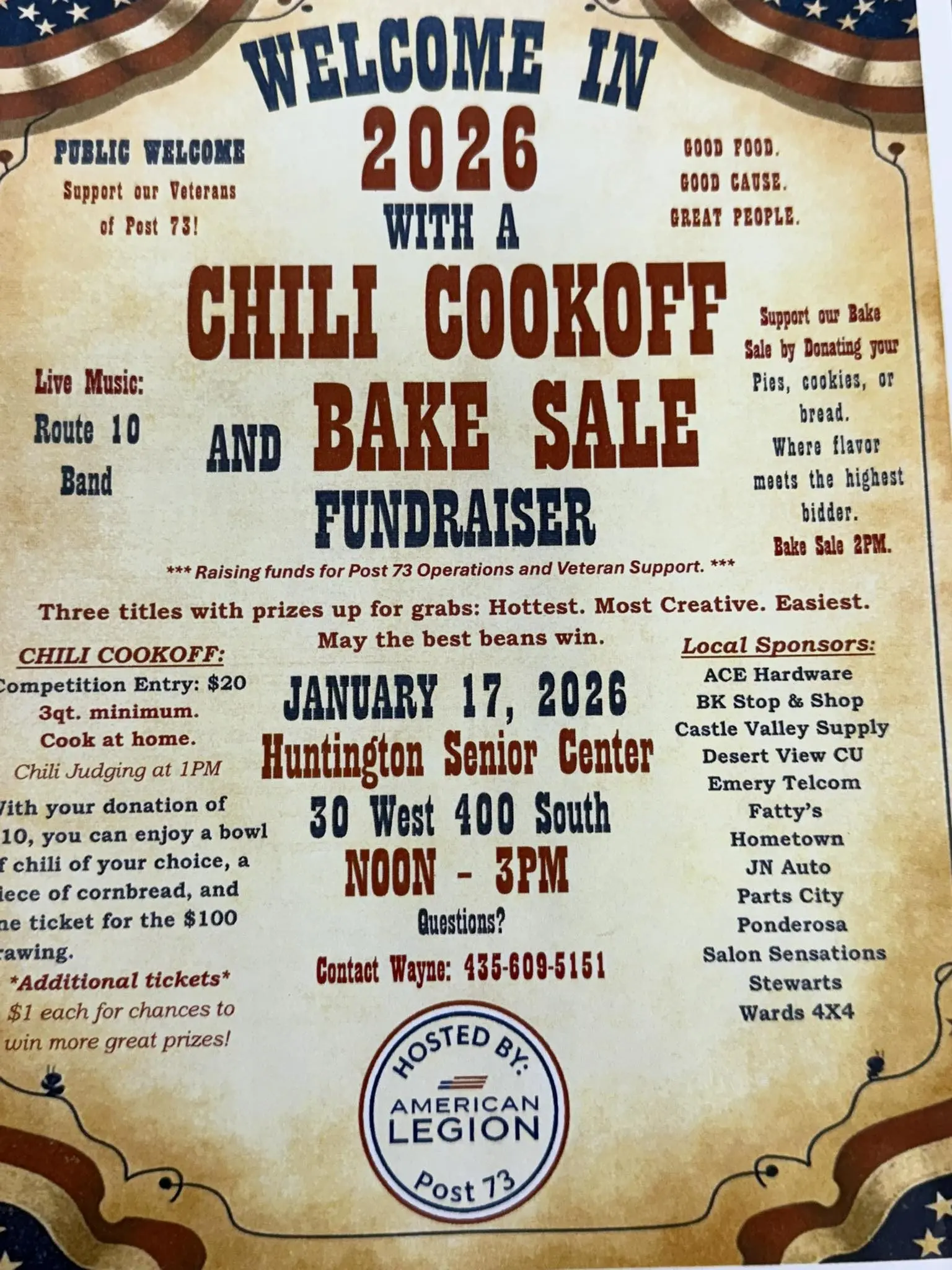 American Legion Post 73 is hosting 2026 Chili Cookoff & Bake Sale Fundraiser