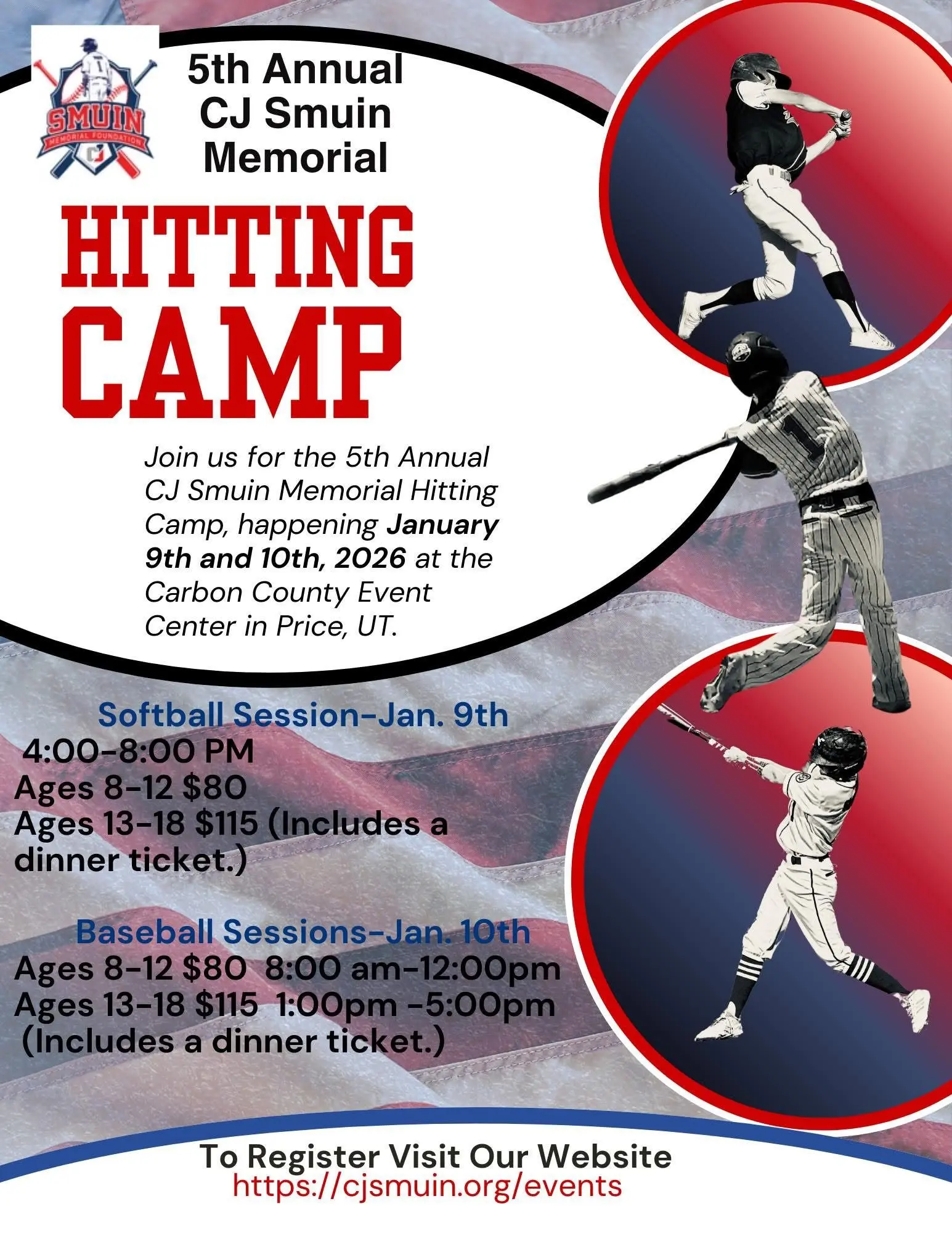 Registration is now open till November 1 for the 5th Annual CJ Smuin Memorial Hitting Camp which is set to take place in January 2026 – The Softball Session will be offered on January 9 and the Baseball Session will be offered on January 10.