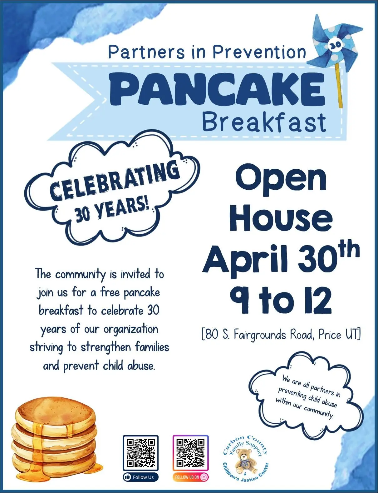The community is invited to join us for a free pancake breakfast to celebrate 30 years of our organization striving to strengthen families and prevent child abuse.