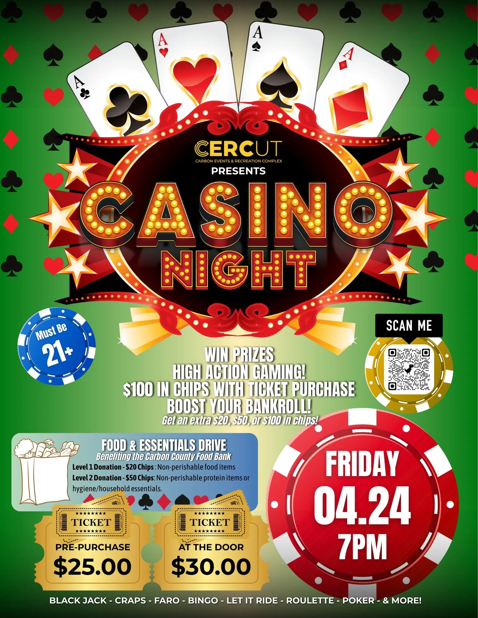 Bring donations for the Carbon County Food Bank and earn even MORE chips to play!