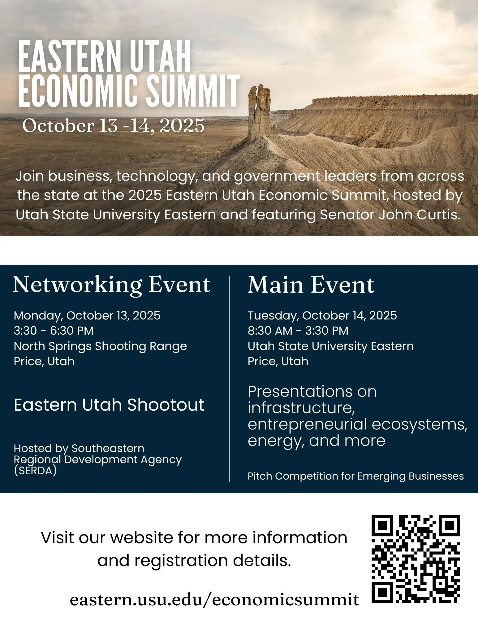 Join business, technology, and government leaders from across Utah at the 2025 Eastern Utah Economic Summit, hosted by Utah State University Eastern and featuring Senator John Curtis. The summit will highlight presentations on infrastructure, entrepreneurial ecosystems, energy, and more, along with a pitch competition for emerging businesses. A networking event kicks off the evening before the main program.
