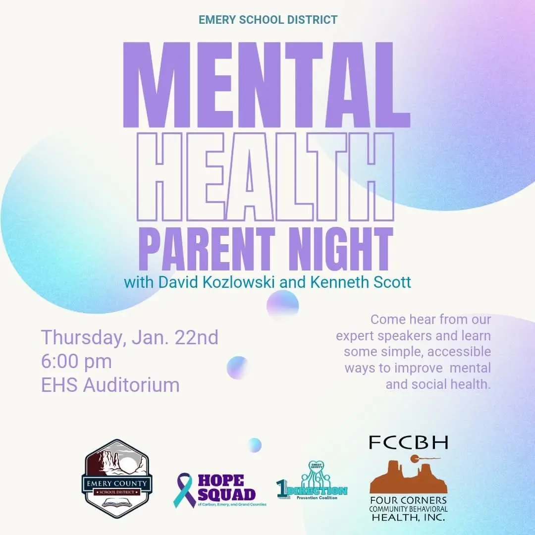 The 1Direction Prevention Coalition and the Hope Squad of Carbon, Emery, and Grand Counties are excited to once again help sponsor the guest speakers for this event and collaborate with the Emery County School District to support youth and family mental health.