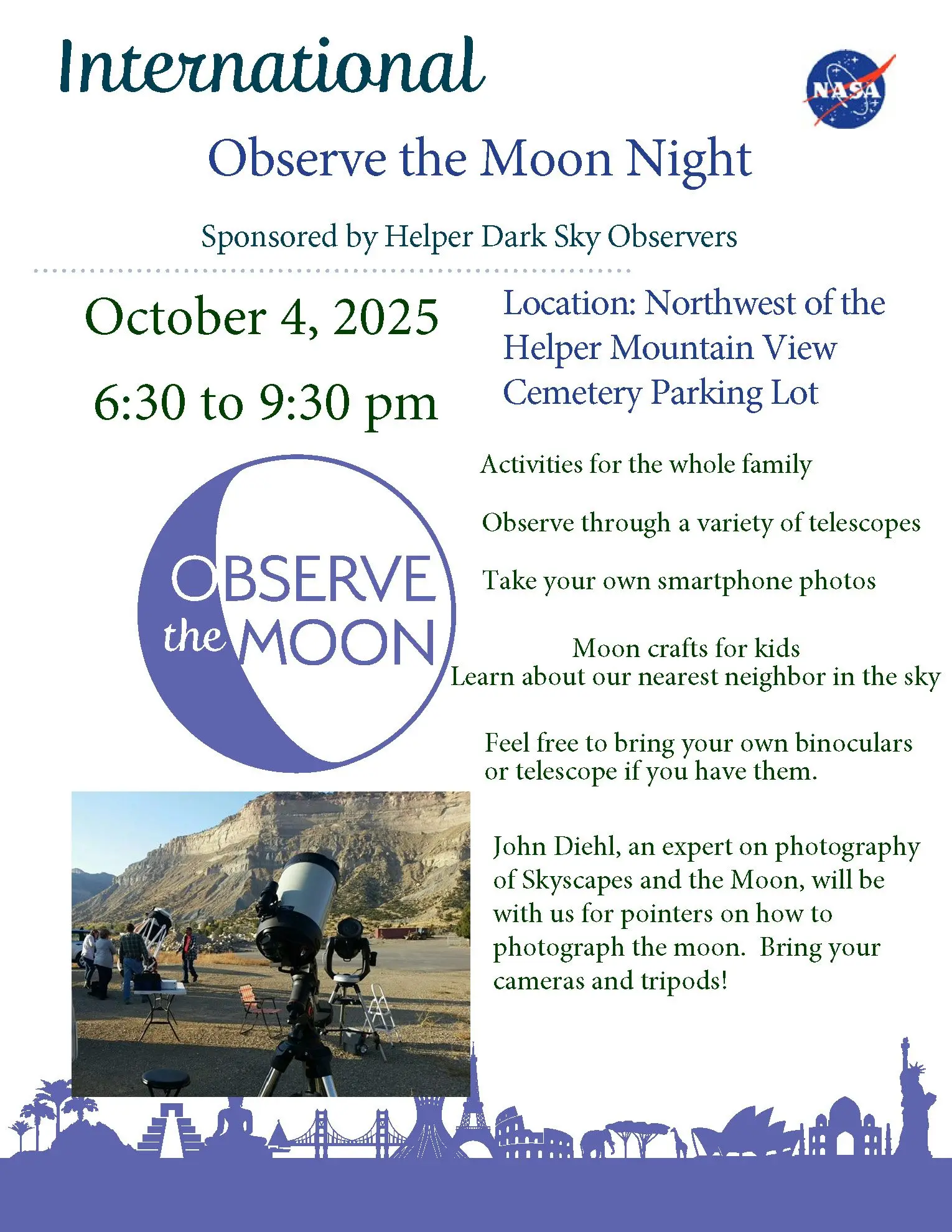 Folks will meet northwest of the Helper Mountain View Cemetery Parking Lot to observe the moon through a variety of telescopes but feel free to bring your own binoculars and telescopes! There will be activities for the entire family to enjoy – come learn about our nearest neighbor in the sky!